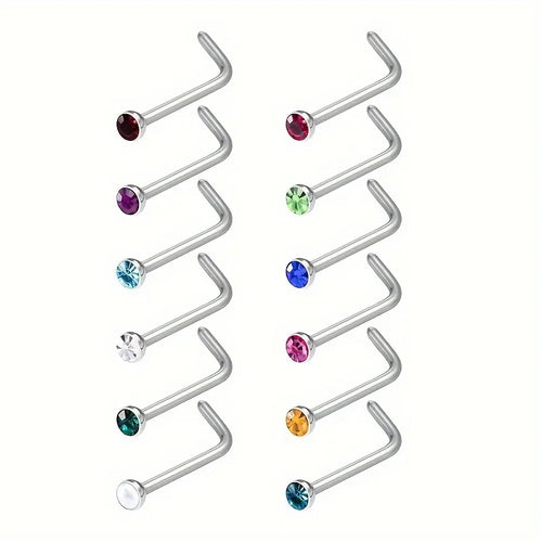 12pcs Stainless Steel L-shaped Rhinestones Nose Ring, Body Piercing Jewelry Nose Nail
